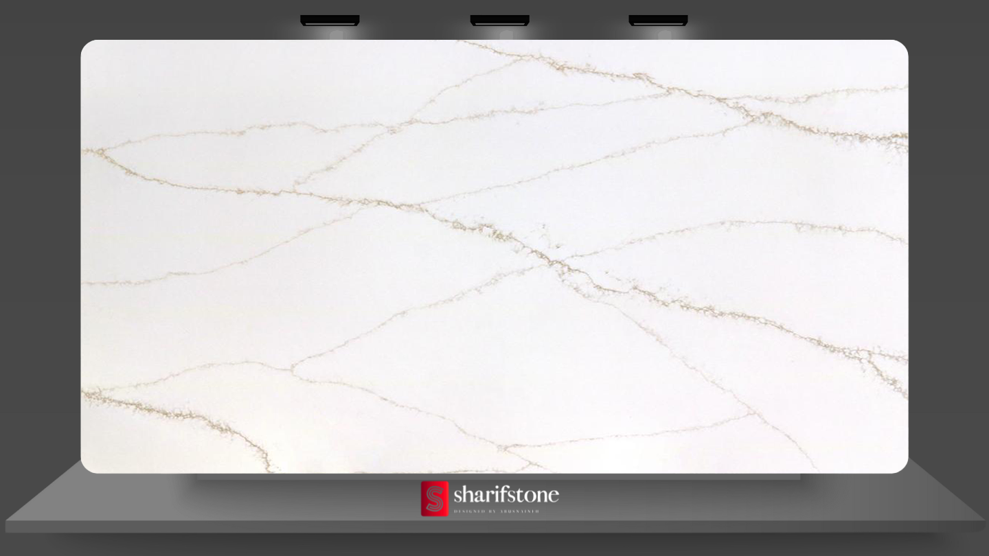 MT Natalia features a crisp white background detailed with slender, interconnected veins in a graceful tan and light gold palette. This minimalist quartz slab offers a clean and modern aesthetic, perfect for creating a bright, spacious feel in any high-traffic residential or commercial application